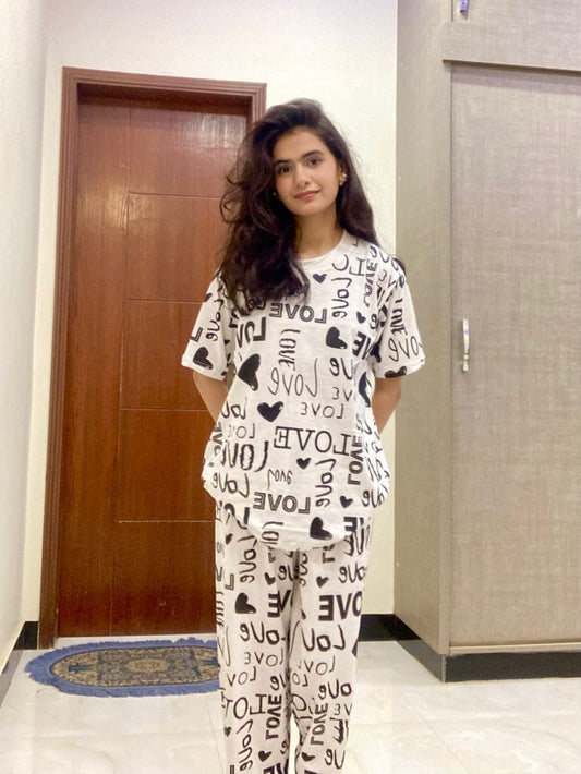 Drop Shoulder Love Printed Night Suit