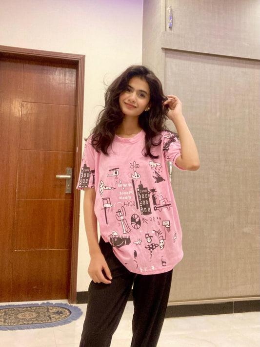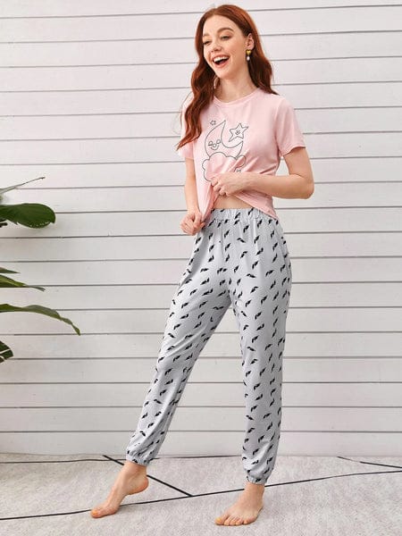 Pink Planet Music With Black Pajama Printed Night Suit