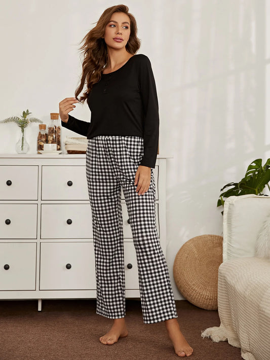 Black And Red Checkered Round Neck Pajama Night Suit