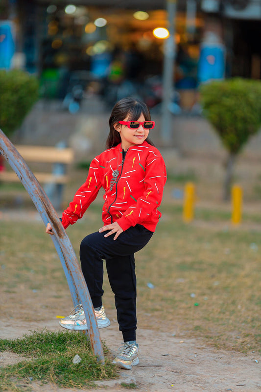 Kids Red Printed Zipper Jacket With Trouser (2 Piece)