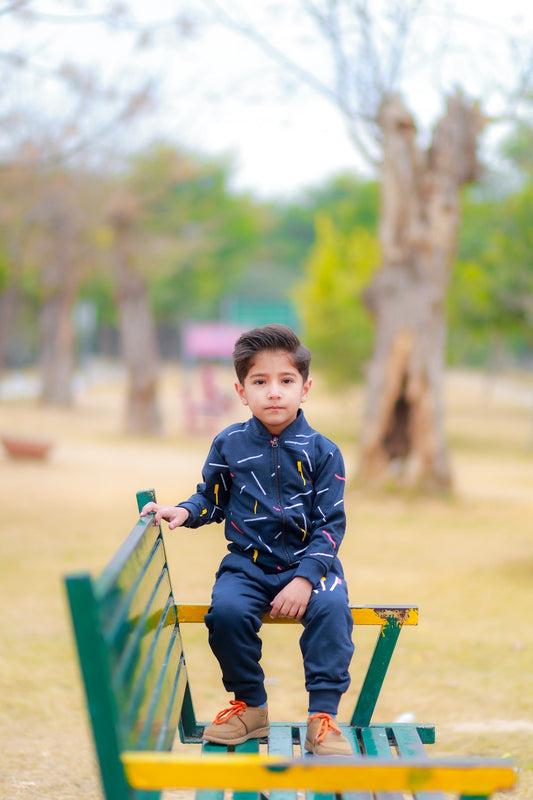 Kids Blue Printed Zipper Jacket With Trouser (2 Piece)