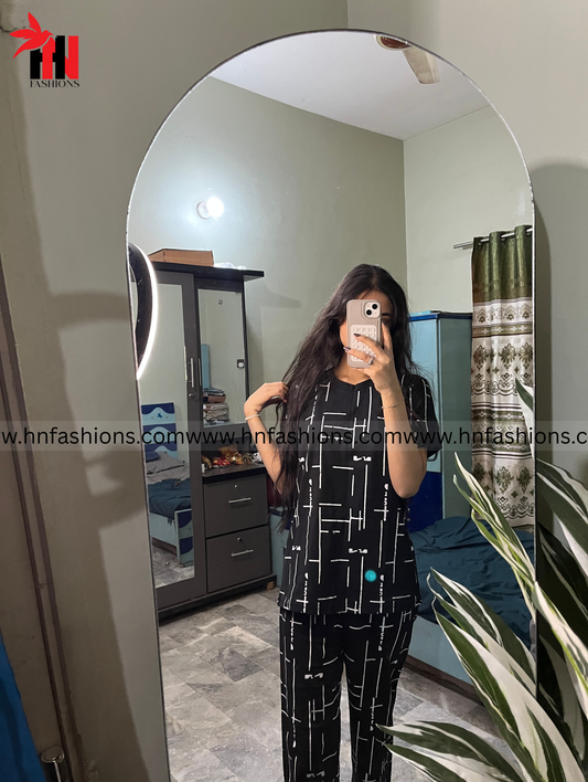 Black with White Smiley Printed V-Neck Button Printed Night Suit