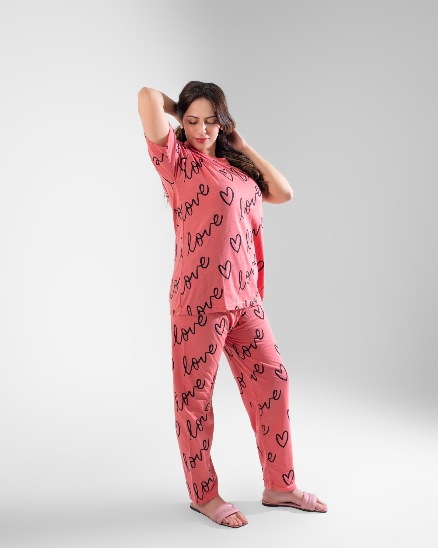 Shocking T-Pink Love Heart Printed Night Suit